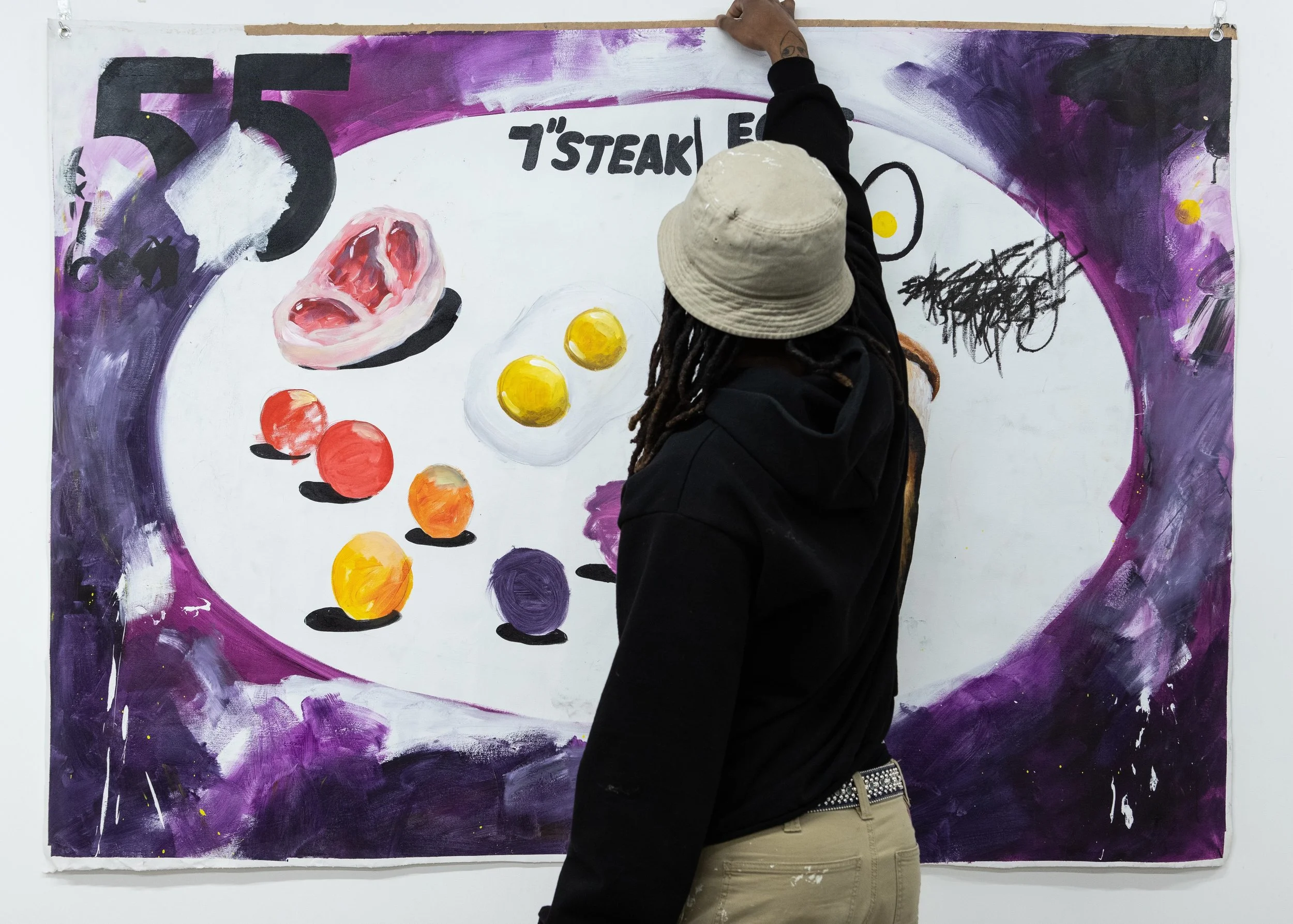 Artist hanging work for photograph in Cloudy Production Studio, 2023